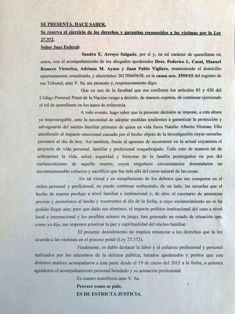 La ex esposa de Alberno Nismal, la jueza Sandra Arroyo Salgado, renunció a la querella en la causa que investiga la muerte del fiscal en enero del 2015. En en un escrito enviado al juez Julián Ercolini aseguró que lo hace "para salvaguardar el núcleo familiar".