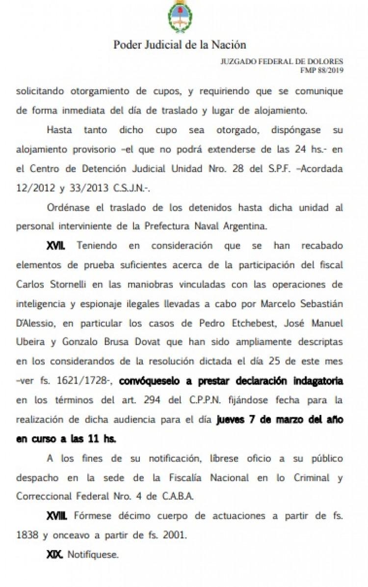 "se han recabado elementos de prueba suficientes acerca de la participación del fiscal Carlos Stornelli en las maniobras vinculadas con las operaciones de inteligencia y espionaje ilegales llevadas a cabo por Marcelo Sebastián D´Alessio, en particular los casos de Pedro Etchebest, José Manuel Ubeira y Gonzalo Brusa Dovat".