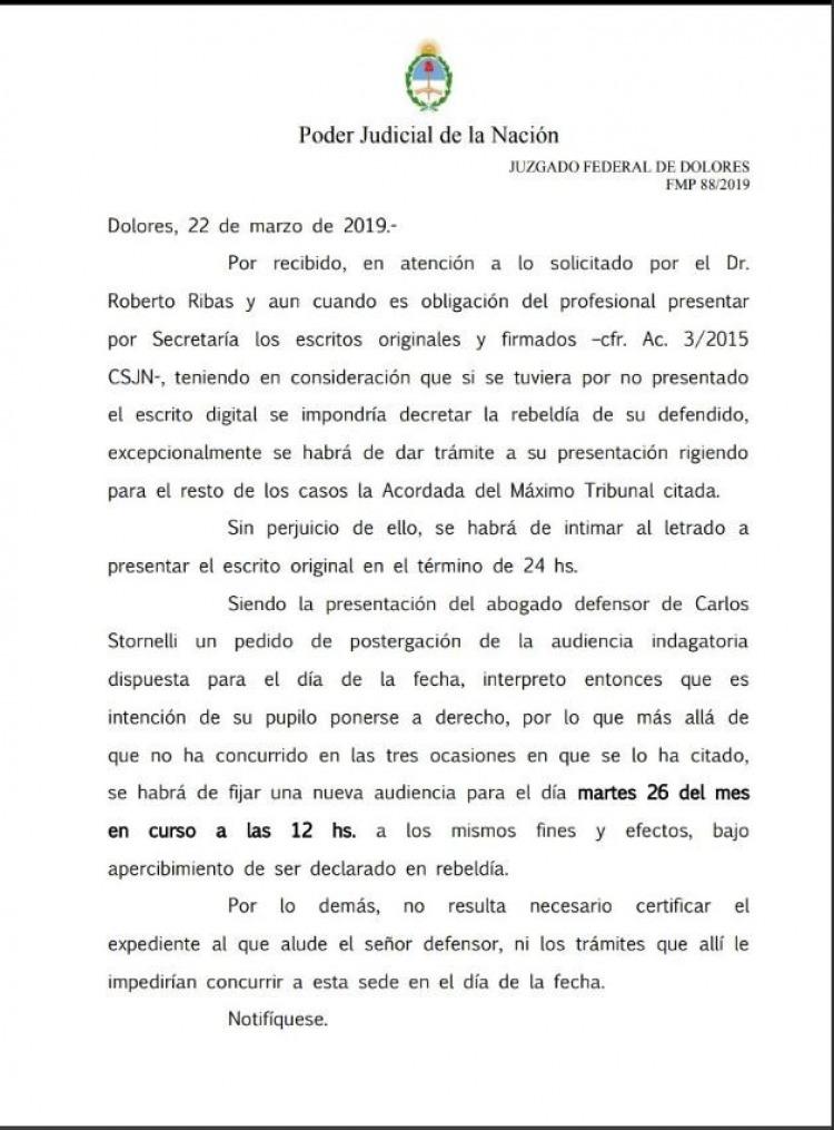 El argumento de Stornelli para conseguir la postergación fue que su abogado Roberto Ribas debía hoy asistir a otra audiencia por lo que le sería imposible asistir a Dolores. El fiscal de la causa de los cuadernos ya había ausentado dos veces a comparecer en el juzgado y esta era la tercera citación que había emitido Ramos Padilla.