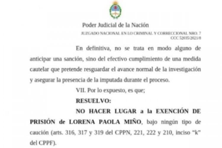 La policía de la ciudad se encuentra prófuga de la justicia desde anteayer cuando se ordenó su detención y no fue localizada en su domicilio. Por su parte, el abogado de Miño, Roberto Castillo, le dijo a Télam que se comunicará con el magistrado para acordar en qué condiciones se presentará su defendida.