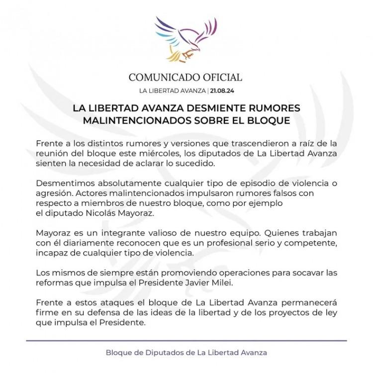 "Desmentimos absolutamente cualquier tipo de episodio de violencia o agresión. Actores malintencionados impulsaron rumores falsos con respecto a miembros de nuestro bloque, como por ejemplo el diputado Nicolás Mayoraz", señaló el bloque oficialista a través de un comunicado publicado en la red social X.