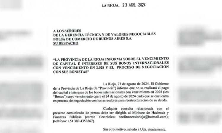 El gobierno de La Rioja comunicó a la Bolsa de Comercio de Buenos Aires que no cumplirá con el pago de las obligaciones correspondientes a los bonos con vencimiento en 2028, situación que ya había llevado a estos títulos a un estado de default. La notificación, enviada el 23 de agosto, hace referencia al vencimiento que operaba al día siguiente y marca un nuevo episodio en la complicada situación financiera de la provincia.