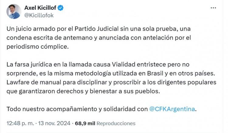 “La farsa jurídica en la llamada causa Vialidad entristece pero no sorprende, es la misma metodología utilizada en Brasil y en otros países. Lawfare de manual para disciplinar y proscribir a los dirigentes populares que garantizaron derechos y bienestar a sus pueblos", remarcó el mandatario bonaerense desde redes sociales.