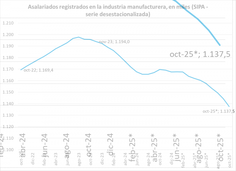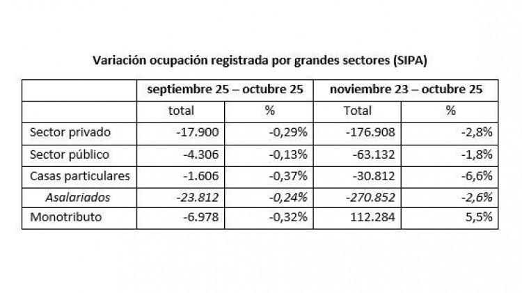 En paralelo, el mercado de trabajo formal siguió un camino inverso. Según el SIPA, octubre marcó una profundización de la caída del empleo registrado y confirmó que,
