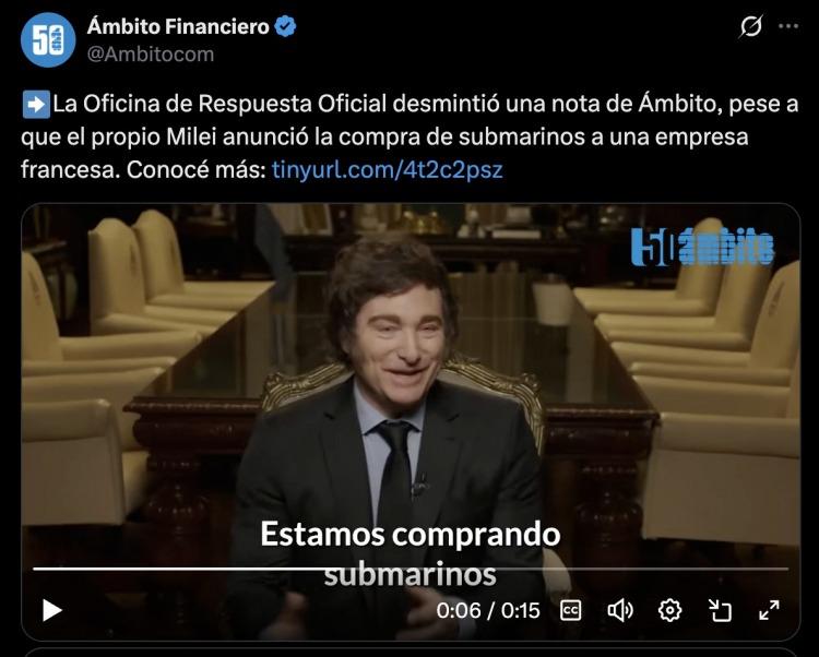 Sin embargo, el desmentido quedó rápidamente en entredicho cuando el diario Ámbito difundió un video en el que se escucha al propio Javier Milei afirmar: “Estamos comprando submarinos”. El registro audiovisual, correspondiente a una entrevista previa, contradijo de manera directa la versión difundida horas antes por la Oficina de Respuesta Oficial.