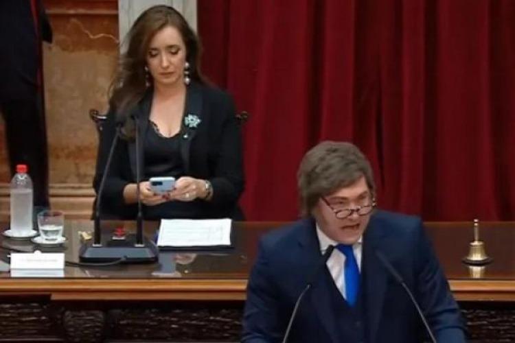 En cuantoa a la vicepresidenta, un rato antes se la vio usando el celular en pleno discurso del mandatario, gesto que se sumó al antes mencionado, ocurrido en el ingreso al Congreso, cuando la presidenta del Senado pareció empujar nada menos que a Karina Milei.