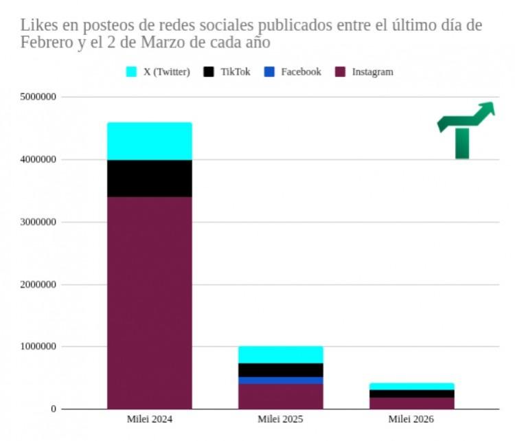 Un relevamiento privado sobre la actividad digital en torno a la apertura de sesiones ordinarias expuso que el presidente Javier Milei atraviesa su peor desempeño en redes sociales desde que asumió. "La performance de los posteos de Milei en redes sigue decreciendo”, advirtió Tendencias Consultora, y detalló que si en 2024 acumulaba más de 4,5 millones de likes, en 2025 bajó a un millón y este año cayó a menos de medio millón tras su discurso ante la Asamblea Legislativa.