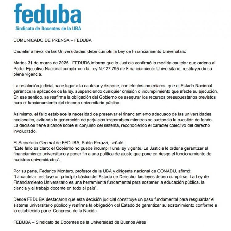 FEDUBA, además, celebró la resolución: "Este fallo es claro: el Gobierno no puede incumplir una ley vigente”, al tiempo que reclamó que se garantice de manera efectiva el financiamiento del sistema universitario público.