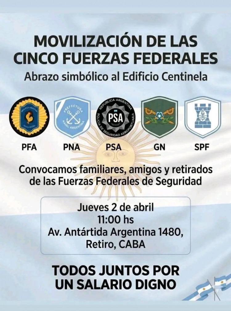 El anuncio se conoció a pocas horas del abrazo simbólico convocado por integrantes de las cinco fuerzas federales frente al edificio Centinela, sede de la Gendarmería, en una manifestación inédita organizada a través de redes y grupos internos para reclamar recomposición salarial y mejoras en la cobertura de salud.