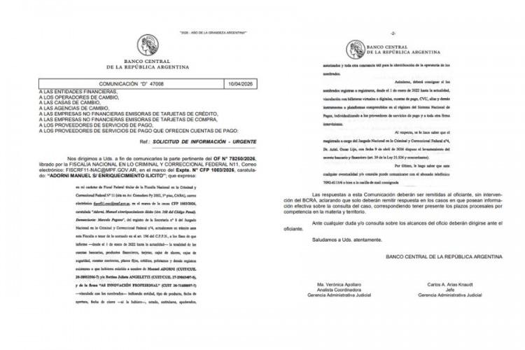 El Banco Central de la República Argentina envió una comunicación urgente a todas las entidades financieras, operadores y proveedores de servicios de pago para que informen si poseen datos vinculados a Manuel Adorni, en el marco de una investigación judicial por enriquecimiento ilícito. La solicitud se enmarca en el expediente CFP 1003/2026, impulsado por la Fiscalía Nacional en lo Criminal y Correccional Federal N°11.