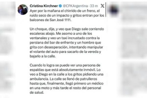 La ex presidenta se refirió al choque ocurrido debajo del edificio donde cumple prisión domiciliaria, que provocó la muerte del militante Adrián Cherasco. “Me enoja mucho que el amor y el agradecimiento tengan tanta mala suerte”, expresó.