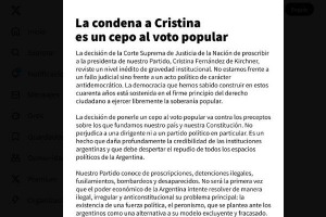"La decisión de la Corte Suprema de Justicia de la Nación de proscribir a la presidenta de nuestro Partido, Cristina Fernández de Kirchner, reviste un nivel inédito de gravedad institucional. No estamos frente a un fallo judicial sino frente a un acto político de carácter antidemocrático",denunciaron.