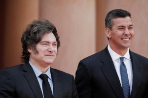 El mandatario argentino viajó a Paraguay por tercera vez desde que asumió su mandato. El encuentro se da en medio de la incertidumbre en los mercados globales por el anuncio de aranceles de Donald Trump.